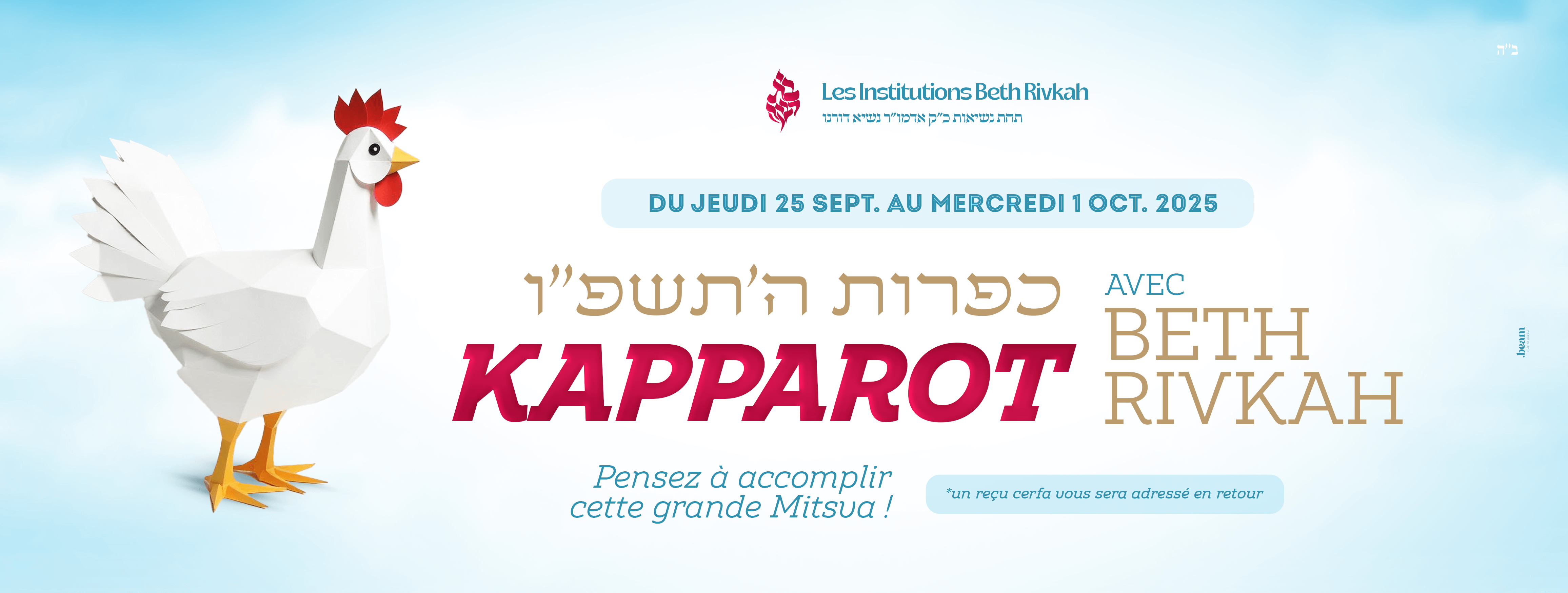 Pensez à préciser en commentaire, lors du paiement, le détail de vos kapparot, nom, prénom des personnes concernées. Vous recevrez un mail de confirmation avec votre reçu CERFA. Cette page permet à toute personne qui serait dans l'impossibilité de se déplacer pour effectuer les Kapparot de s'acquitter facilement de la Mitsvah.